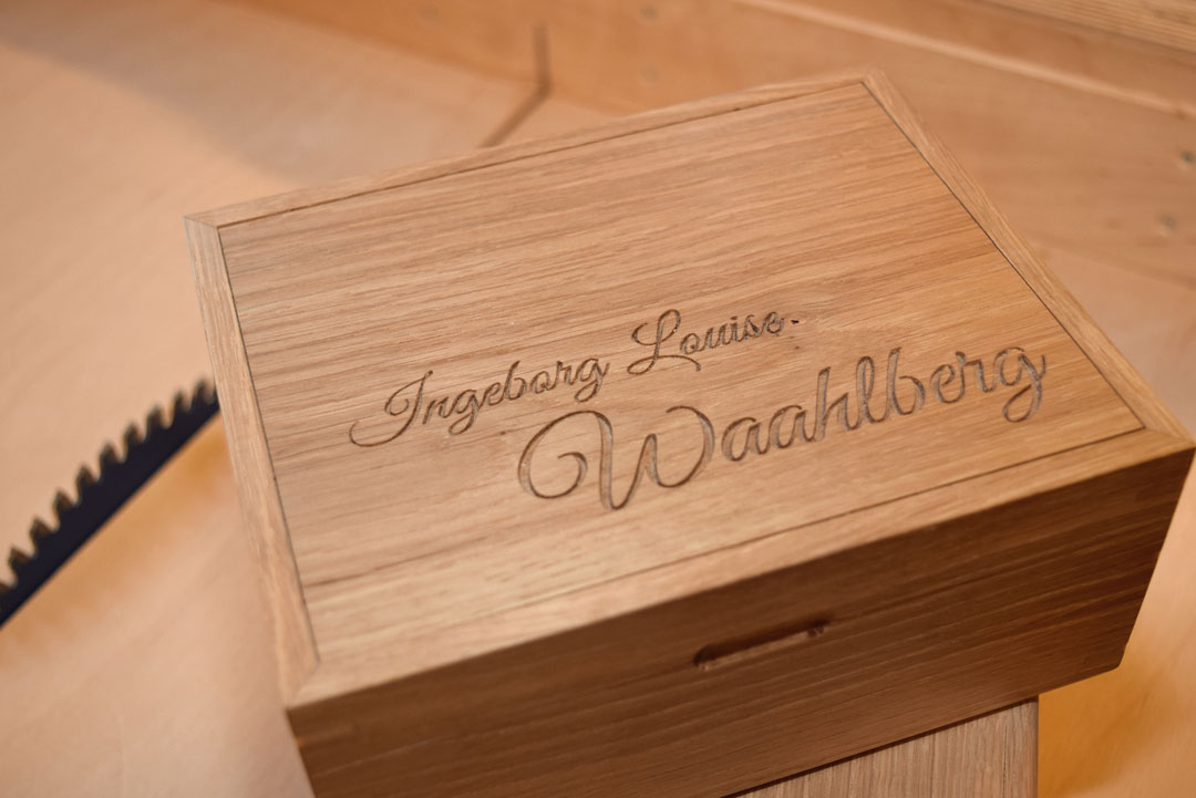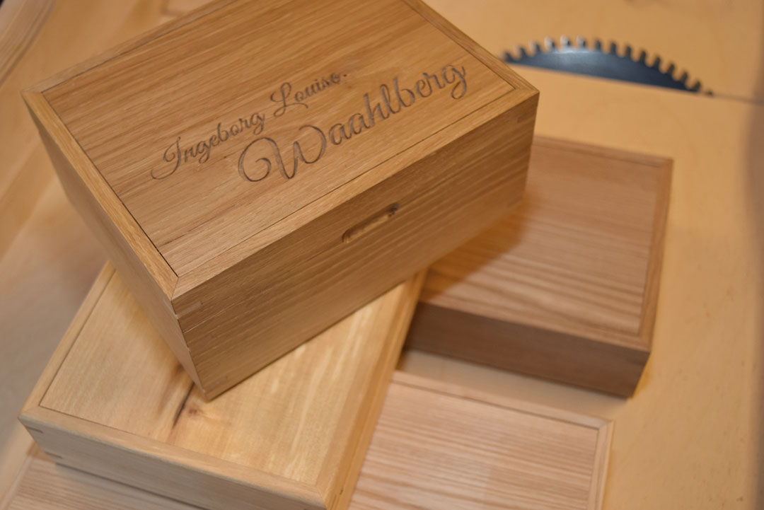 – Kunder bestiller også firmagaver og gaver til ansatte. Skrinene kan leveres med personlig gravering, som navn og dato på lokket og en hilsen på innsiden.