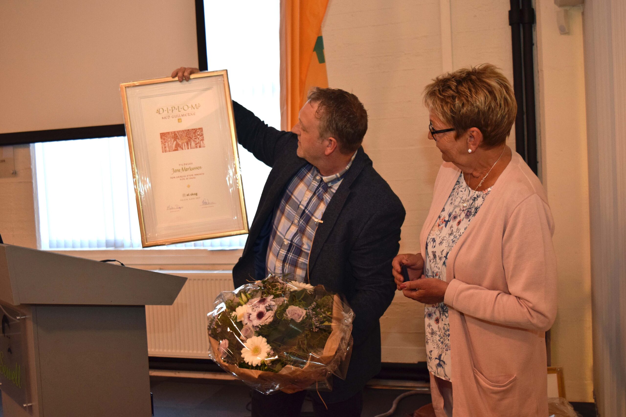 Styrets ordfører, Morten Rogn, delte ut diplom og gullmerke. Hedersbeviset tildeles medlemmer, ansatte og andre, som over lang tid har fremmet AT Skog.