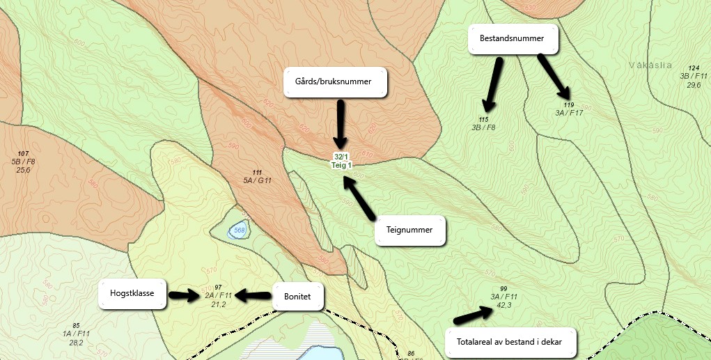 Se forklaringer i kartet. Lys farge (hvit, gul og lys grønn) betyr ung skog. Mørkere farge (mørk grønn og rød) betyr eldre skog.