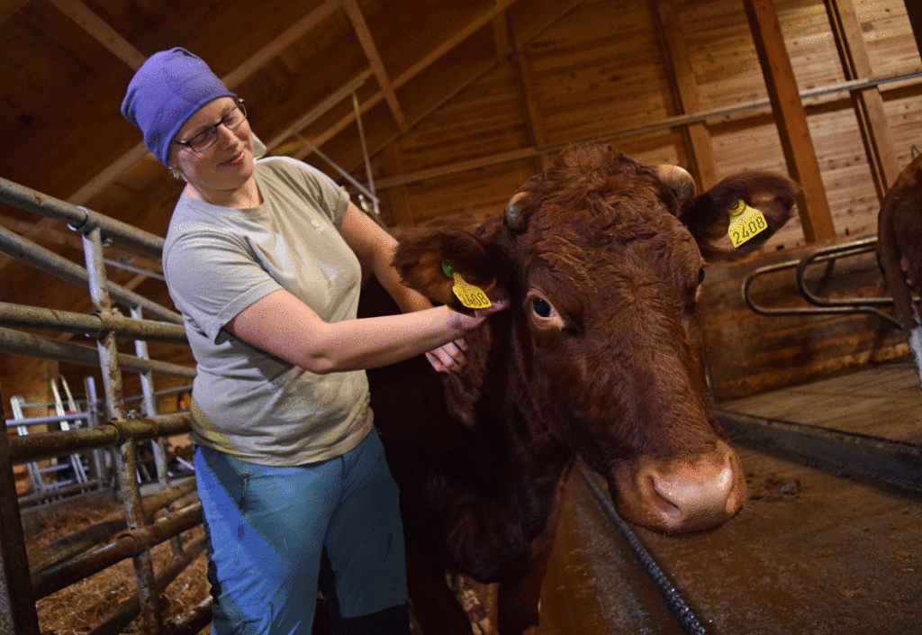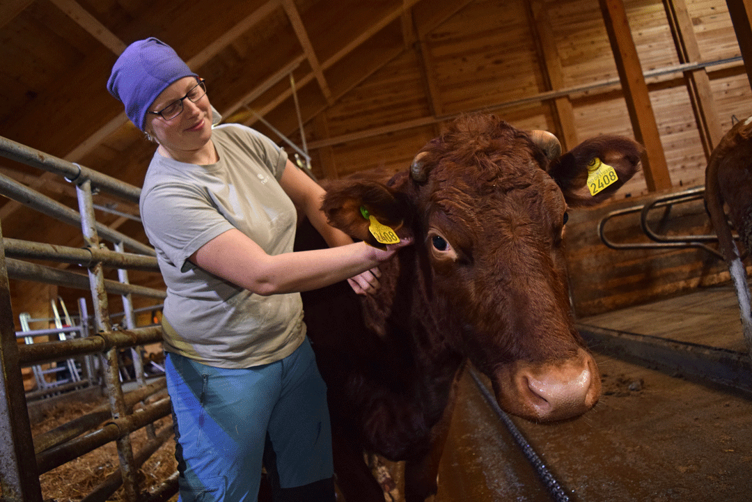 – Det er en veldig rolig stemning i fjøset uten stål og betong. Vi er også opptatt av å være mye sammen med dyrene. Kontakt er viktig. Vi har skrape som fjerner møkk, men ellers ingen automatiske løsninger. Det var et bevisst valg at vi vil bruke tid i fjøset og være mye sammen med dyrene, forklarer Elin.