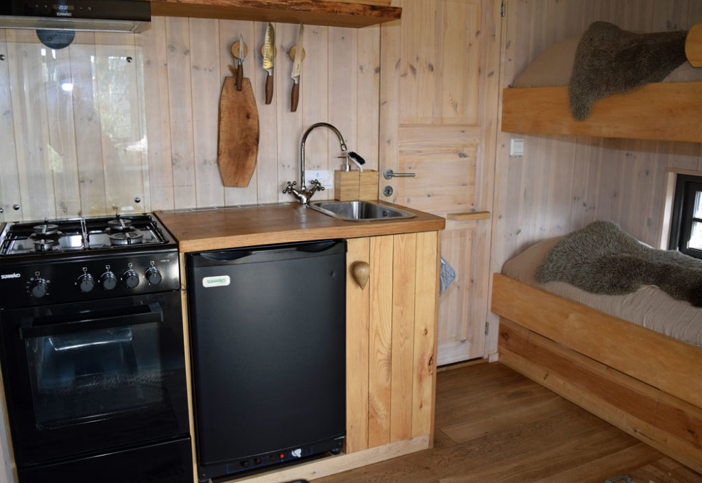 – På alle hyttene har jeg brukt mange ideer fra Pinterest, for eksempel skillevegg med bjørkestammer og en skyvedør laget av et tre fra Slottsparken. Arkitekten har tegnet skallet på trehyttene, mens jeg har hatt frie tøyler på interiøret, forklarer Åse Kristine.