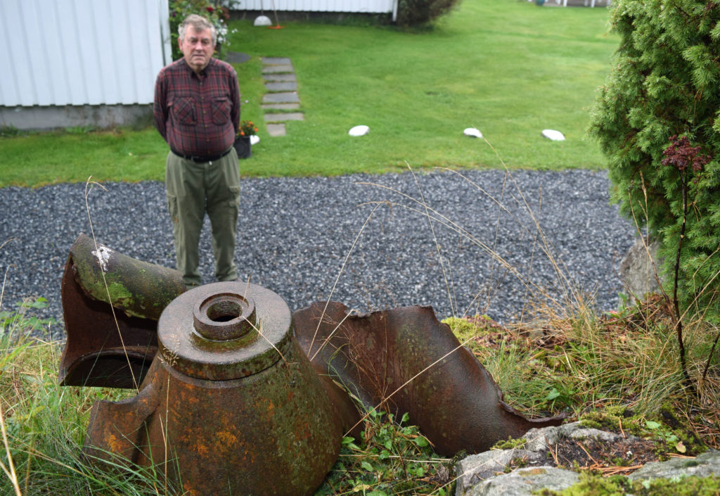 Han snakker med mange av dem. Bare hyggelige folk, forsikrer skogeieren på tunet. Den første infotavlen henger på husveggen hans. Den forklarer hvordan foreldrene måtte utsette bryllupet i 1943 da Norsk Hydro plutselig ble bombet. En rusten del av en bombe ligger rett ved huset.