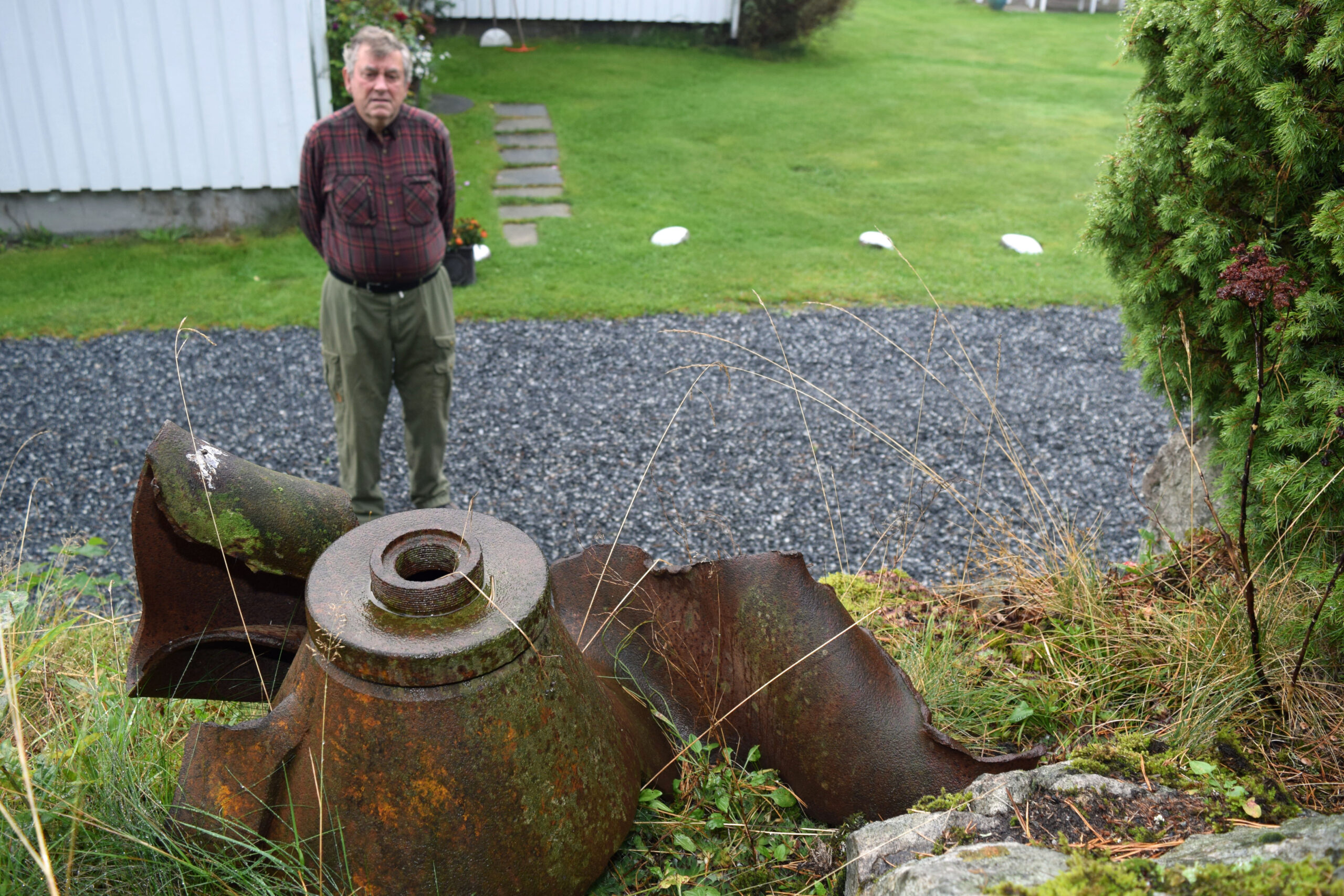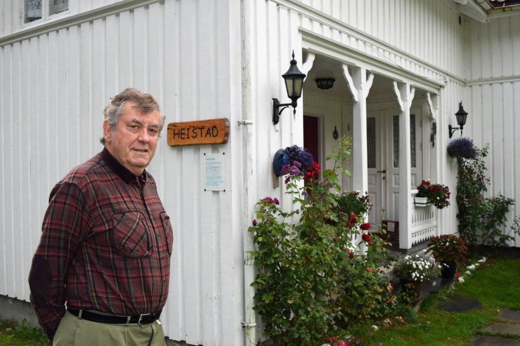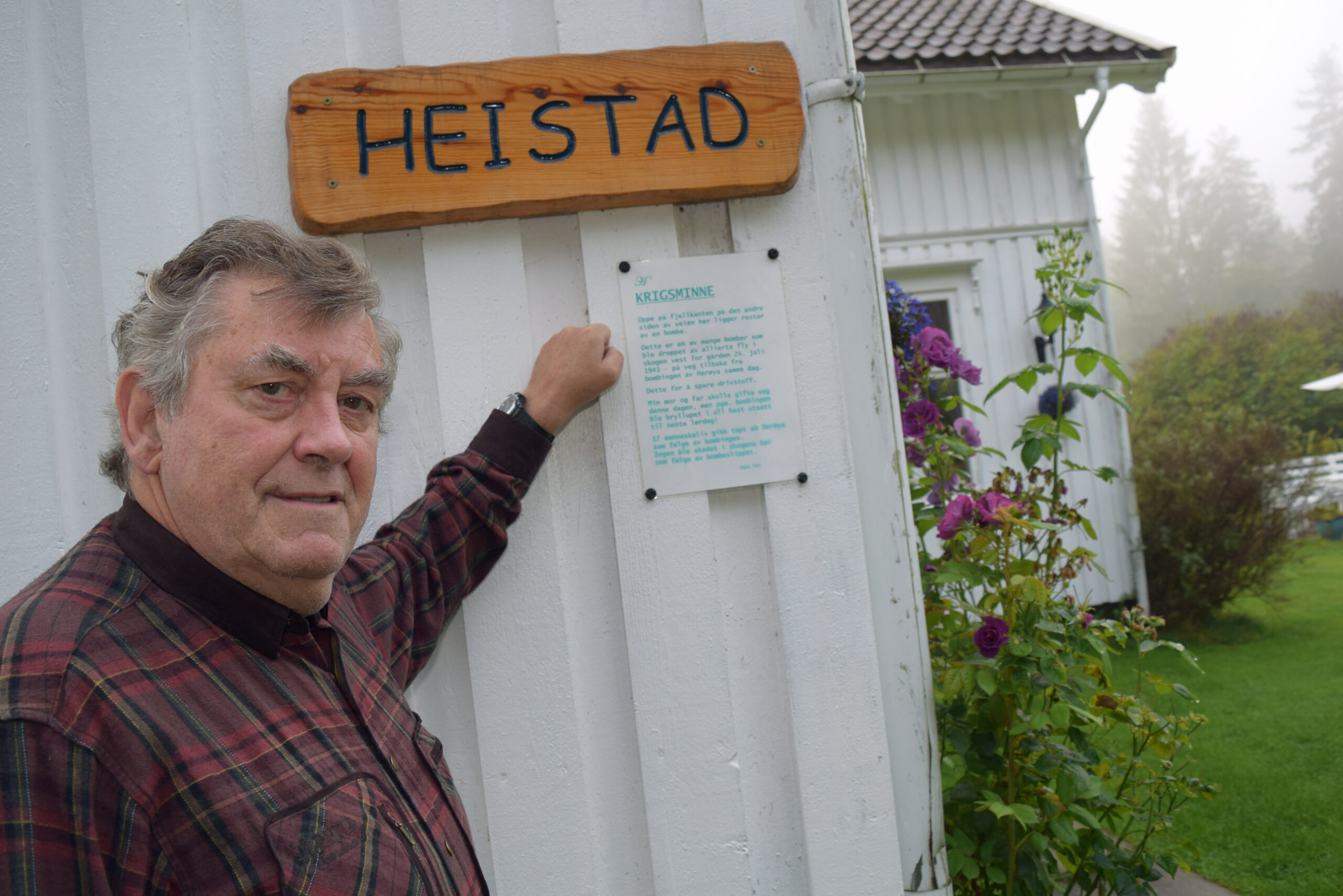 Han snakker med mange av dem. Bare hyggelige folk, forsikrer skogeieren på tunet. Den første infotavlen henger på husveggen hans. Den forklarer hvordan foreldrene måtte utsette bryllupet i 1943 da Norsk Hydro plutselig ble bombet. En rusten del av en bombe ligger rett ved huset.