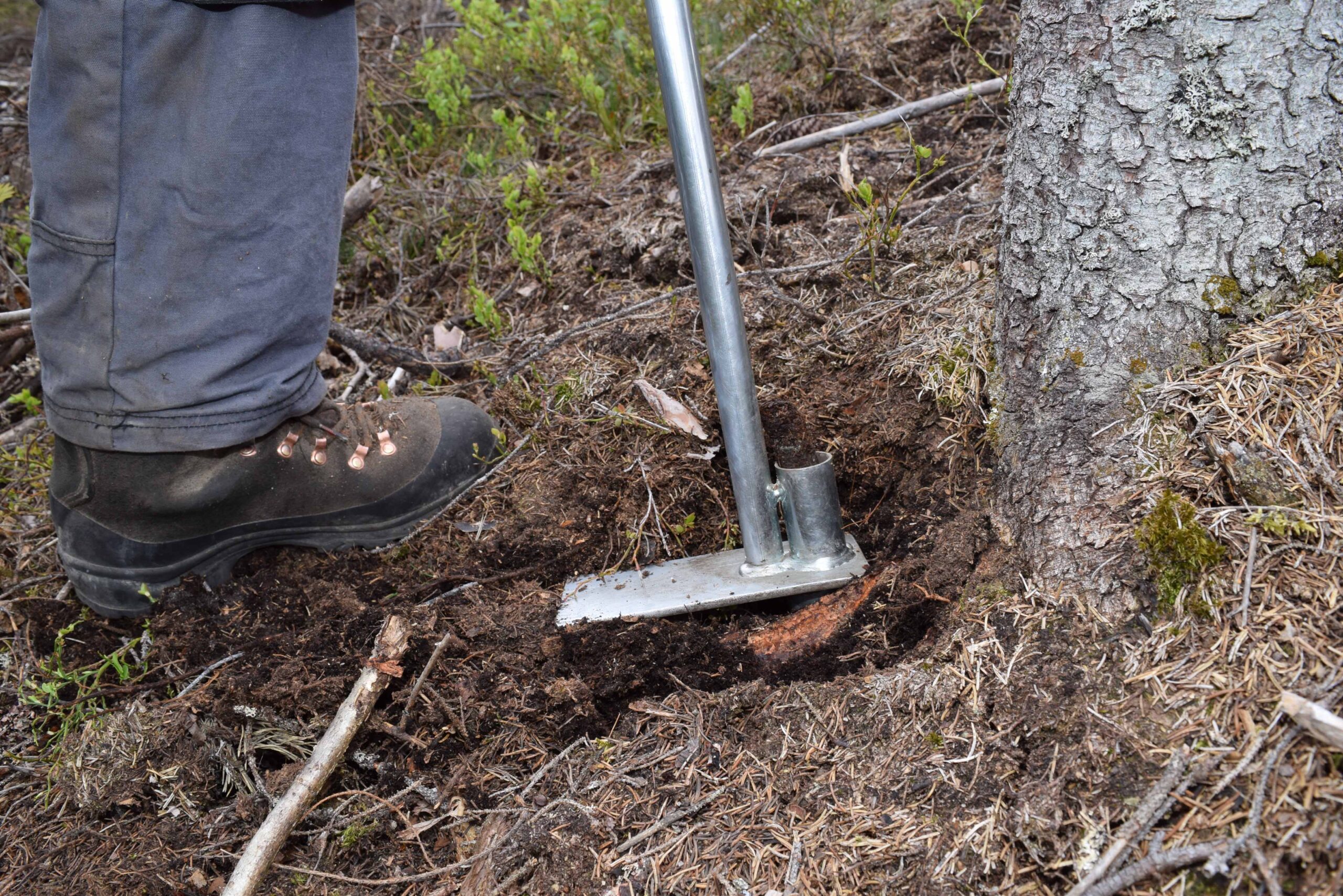 Med et redskap, som kalles både plantespett og hullpipe, lager han plass i jorda til plantens rot.