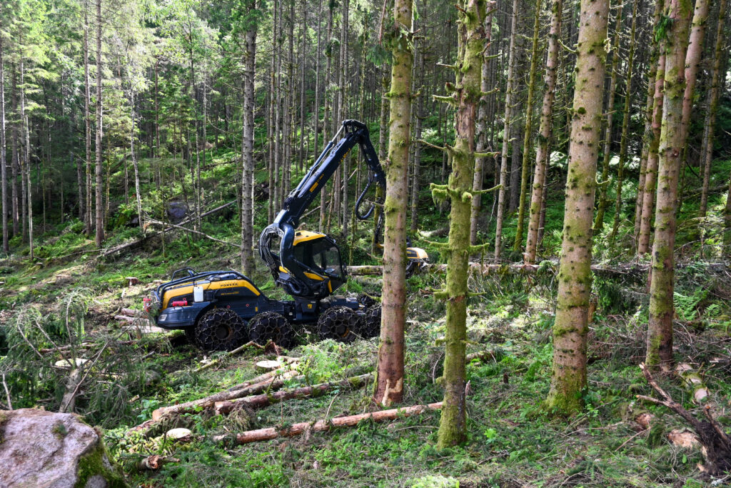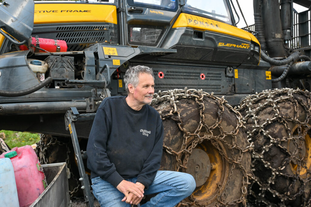 – Jeg hadde brukte maskiner i starten og skrudde selv. Da kona begynte å kjøre skogsmaskin, sa hun klart i fra at hun ble sprø av for mye skruing. De siste 25 årene har jeg byttet ut maskinene jevnlig. De to maskinene vi har nå, er rundt to år gamle, forklarer han, mens han setter seg på stigbrettet på lassbæreren av typen Ponsse Elephant. I skogen hører vi lyden fra hogstmaskinen, en Ponsse Scorpion.