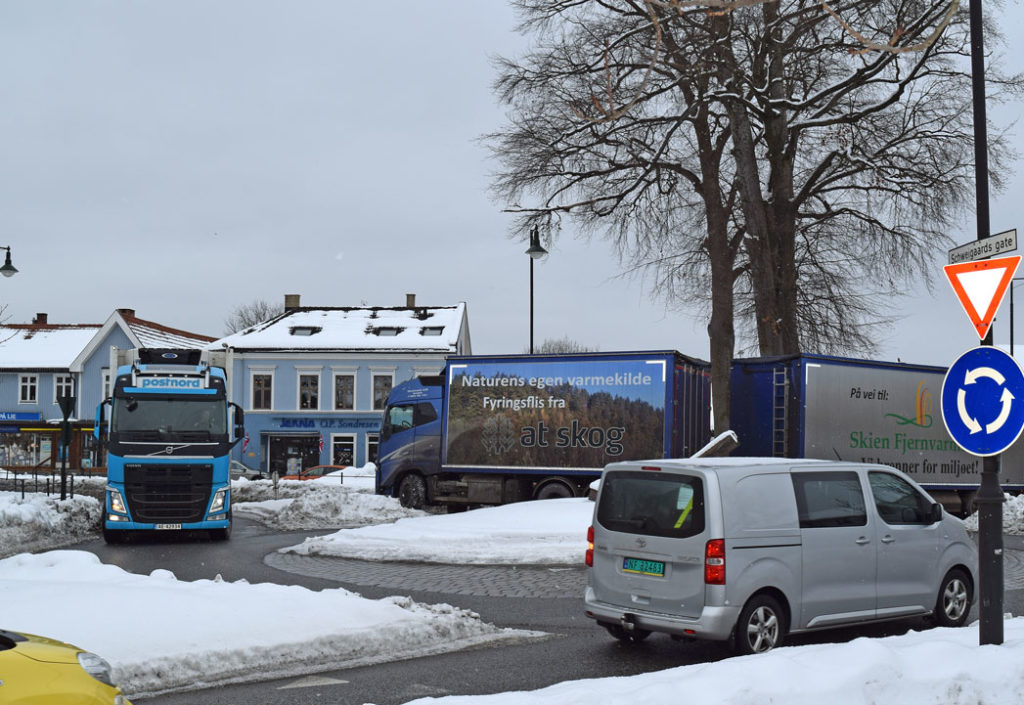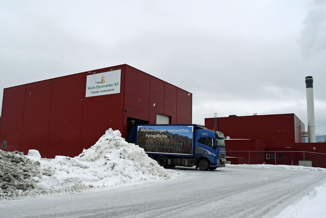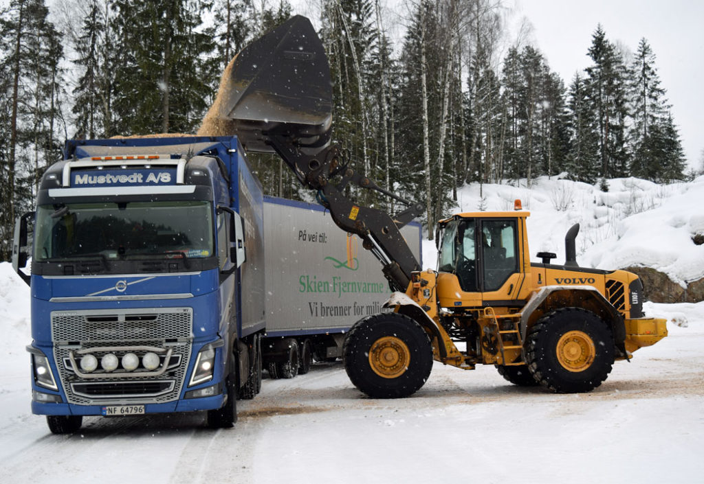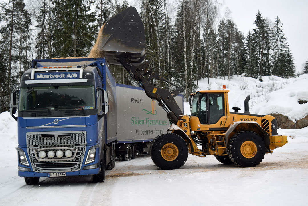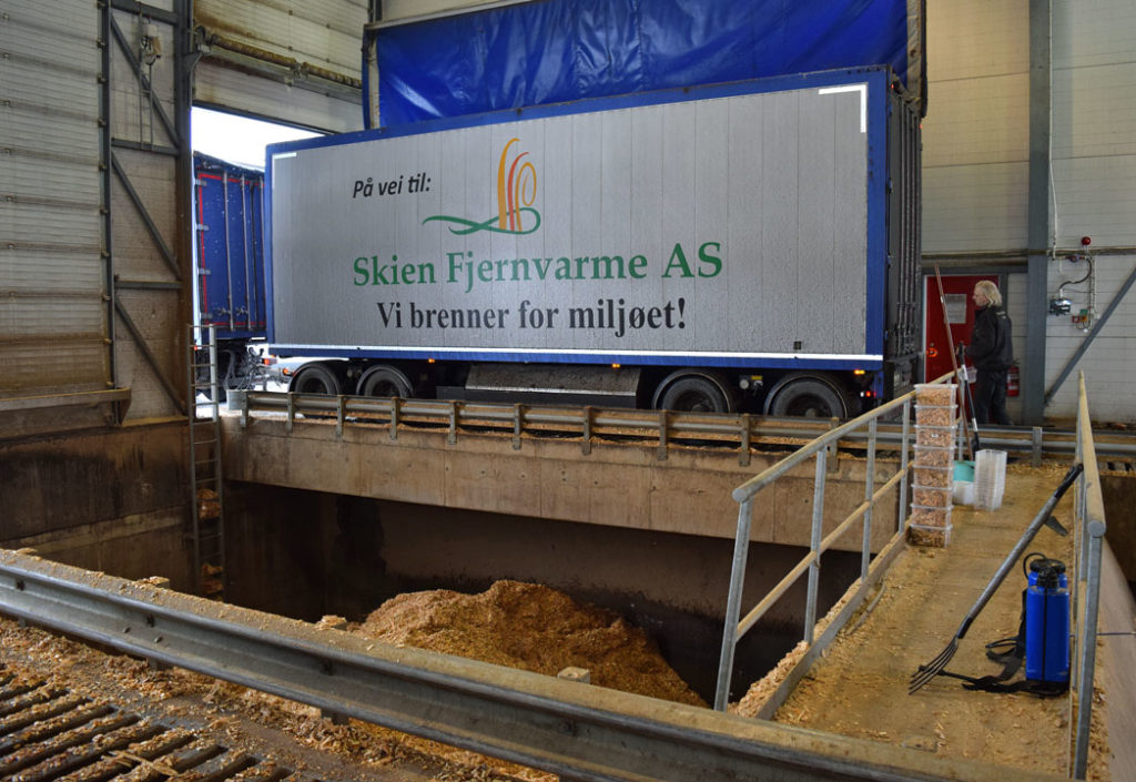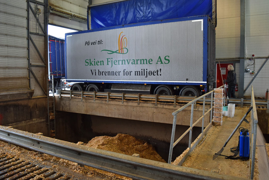 Yrkessjåføren frakter flis til Skien fjernvarme, som forsyner blant annet Sykehuset Telemark, Skien fritidspark, skoler og nyere leiligheter med varmtvann og husvarme.